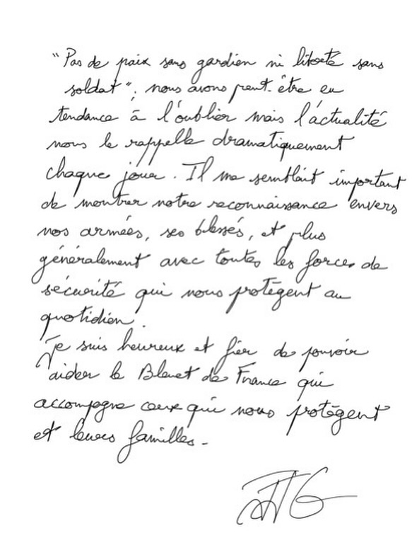 À l'occasion des commémorations du 11 novembre, Jean-Jacques Goldman s'engage avec le Bleuet de France. En plus du clip de la chanson "On sera là", écrite de sa main, le chanteur partage une lettre dans laquelle il s'adresse aux Français.